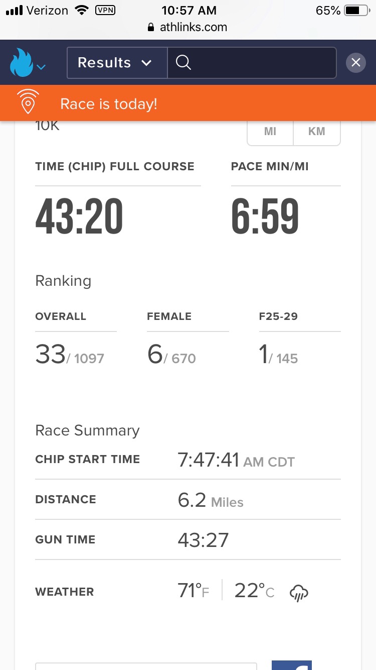 Then just before mile 5, I saw my husband cheering and I caught the 1:30 half marathon pace group. This gave me a little energy, but I was still feeling like garbage. I told myself if I could stick with them I could ensure my remaining miles were under 7 minute pace. I knew this was a tall task because I was also starting to have some GI issues (sorry for the TMI). I told myself to focus on sub 7 minute miles and not pooping (again, sorry for the TMI, but aren’t we all runners here? 😛 ). I was successful with my second goal (LOL), but not my first goal. Mile 5 was a 6:55 and mile 6 was a 7:05. I was able to kick it in around 6 minute pace for the final 0.2, but it did not feel great, especially with the GI discomfort. My overall time was 43:20, which is technically a 38 sec PR, but that’s not saying much when my first 10k last year was also run untrained.